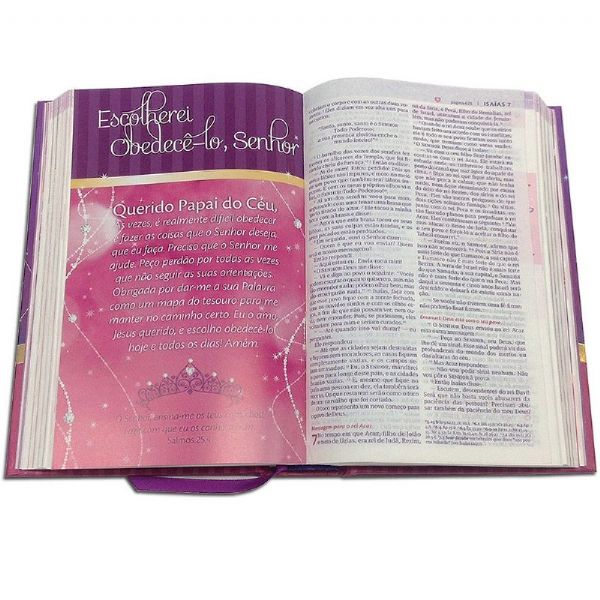 A Bíblia Minha Linda Princesinha é perfeita para princesas de todas as idades! Uma Bíblia única, pois além o texto bíblico na versão Nova Tradução na Linguagem de Hoje, ela vem com características especiais escritas por Sheri Rose Shepherd. Suas páginas são coloridas em tons de rosa e lilás, juntamente com mais de 500 versículos bíblicos destacados, voltados para as princesas de Deus, tornando mais agradável a leitura das histórias.