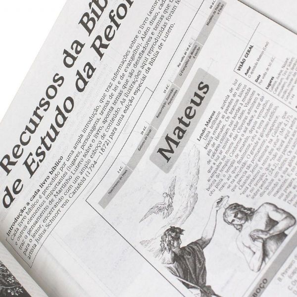 A Bíblia de Estudo da Reforma apresenta um rico e vasto material como notas, artigos e orações com base em cada livro das Escrituras Sagradas. Todos os livros da Bíblia trazem uma introdução sobre o pensamento de Martinho Lutero, bem como um amplo esboço com detalhes históricos e artigos. O objetivo desta publicação é estimular no leitor a reflexão sobre o legado trazido pela Reforma e, especialmente, resgatar as raízes da Reforma Protestante, ao destacar a centralidade da Bíblia para a fé e a vida cristã. Para esta Bíblia de Estudo, adotou-se a consagrada edição Almeida Revista e Atualizada (RA). Fiel aos originais e uma das traduções preferidas pelos leitores, a RA segue a divisão padrão de capítulos e versículos e traz vários subtítulos que ajudam o leitor a visualizar rapidamente o conteúdo das divisões/seções do texto bíblico. Nesta edição, o texto bíblico aparece disposto em duas colunas, com divisão por parágrafos.
